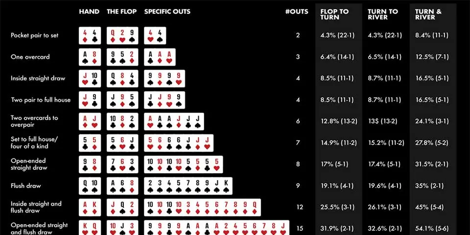 Για να αποφασίσετε αν πρέπει να κάνετε call, πρέπει να συγκρίνετε τα pot odds με τις πιθανότητες βελτίωσης του χεριού σας (γνωστές και ως “hand odds” ή “implied odds”). Οι πιθανότητες βελτίωσης του χεριού σας υπολογίζονται με βάση το πόσα outs έχετε (φύλλα που θα σας δώσουν το κερδισμένο χέρι).